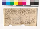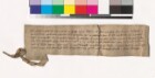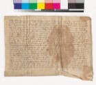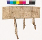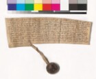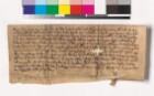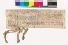 [ Tilføyelse vedheftet første seglrem, skrevet med en annen hånd]: Asle, hans frende, og sveinen hans, Alv, skal ha hans skip Dragsmarken, sira Hallvard hans breviar, Torgeir Mattiasson en hest, Langbein en kjortel og den folen som Eindride hæitir eide, Andres den folen som Solve Ogmundsson gav ham og en som Arne på Halgeirs riodræ har, Asle den folen som Jon Darre eide, og Alv og Åsa skal ha noen klær.