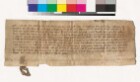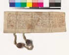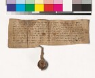 [ Tilføyelse vedheftet første seglrem, skrevet med en annen hånd]: Asle, hans frende, og sveinen hans, Alv, skal ha hans skip Dragsmarken, sira Hallvard hans breviar, Torgeir Mattiasson en hest, Langbein en kjortel og den folen som Eindride hæitir eide, Andres den folen som Solve Ogmundsson gav ham og en som Arne på Halgeirs riodræ har, Asle den folen som Jon Darre eide, og Alv og Åsa skal ha noen klær.