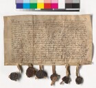 - Salgsbrev fra Arne Aslaksson, kansler og prost ved Mariakirken i Oslo, og kapitlet samme sted: Kannik ved samme kirke, sira Magnus Siggeson, har solgt 5 øb i Kuænnini i Grue sogn i Solør, som tilhørte Mariakirken, til Kjetil Tordsson, på kirkens vegne, og med kapitlets råd og samtykke. Sira Magnus har fått full betaling - 20 mark i gjengs mynt. Beseglet av utstederne og sira Magnus.