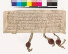 [ Tilføyelse vedheftet første seglrem, skrevet med en annen hånd]: Asle, hans frende, og sveinen hans, Alv, skal ha hans skip Dragsmarken, sira Hallvard hans breviar, Torgeir Mattiasson en hest, Langbein en kjortel og den folen som Eindride hæitir eide, Andres den folen som Solve Ogmundsson gav ham og en som Arne på Halgeirs riodræ har, Asle den folen som Jon Darre eide, og Alv og Åsa skal ha noen klær.