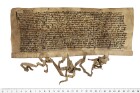 Vitnisburðarbréf ellefu klerka um mótfall Hrafns Brandssonar lögmanns og lögréttumanna við Ólaf Rögnvaldsson Hólabiskup frammi haft í lögréttu á Öxarárþingi með harki og háreysti og lemjandi höndum, og höstuðu þeir biskup út af lögréttunni og sögðu, að hann ætti ekki að vera þar.